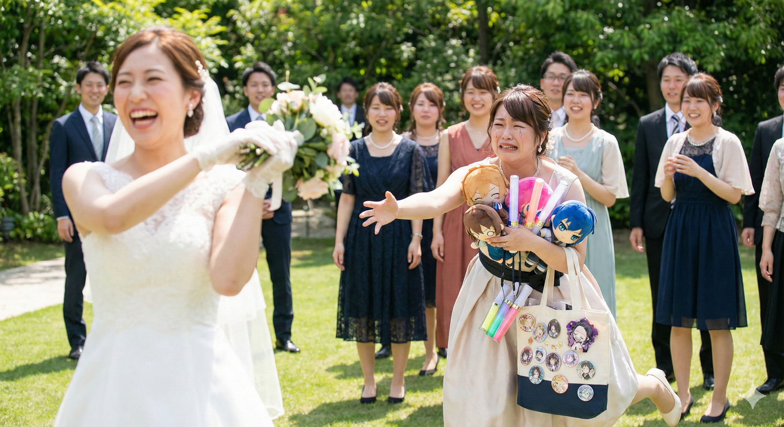 ブーケトスをする花嫁と、ぬいぐるみやペンライトを抱えて泣きながらブーケを取ろうとする女性