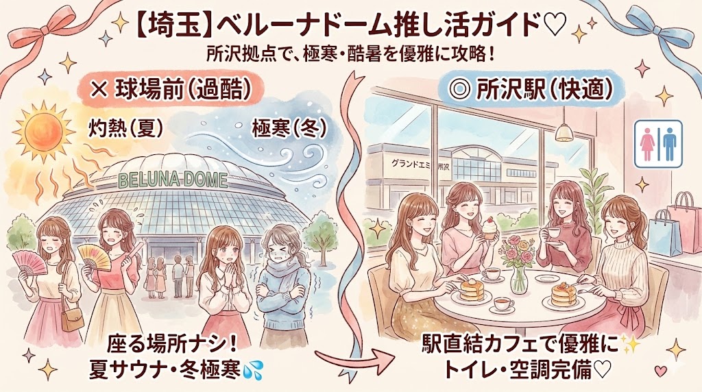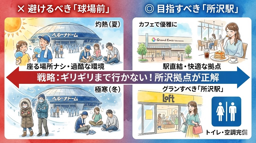そんなベルーナあるあるを回避するために。 今回は、ドーム前の過酷な環境を避け、直前まで文化的な生活を送るための「所沢駅」拠点プランをご提案します。