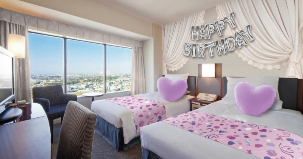 お泊まり推し会のパイオニア。「尊いボタン」やペンライト、デコレーション用グッズが完備されています。フラワーバスや無料のワインサービスなど、お姫様気分で推しを語り合えます。 「本人不在の誕生日会」プランや、選べるカラーハニトーもありオタクに優しいホテル♡