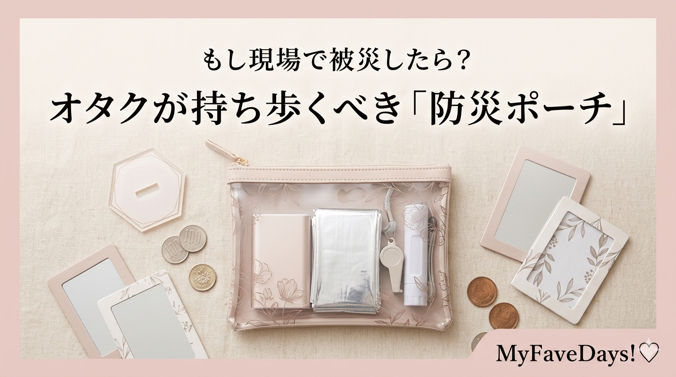 遠征やイベントなど、アクティブに動くことが多い私たちオタクにとって、もしもの備えは自分の命を守るための大切なアクションです。カバンの隅に防災ポーチが一つあるだけで、心に余裕が生まれて、安心して推し活を全力で楽しむことができます。