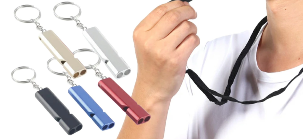 万が一身動きがとれなくなったりしたときに、大きな音を出して助けを呼ぶためのアイテムです。大声を出し続けるのは体力をひどく消耗してしまいます。ダイソーなどの公式ネットストアでも、キーチェーン付きでカバンやポーチに付けやすいホイッスルが販売されています。