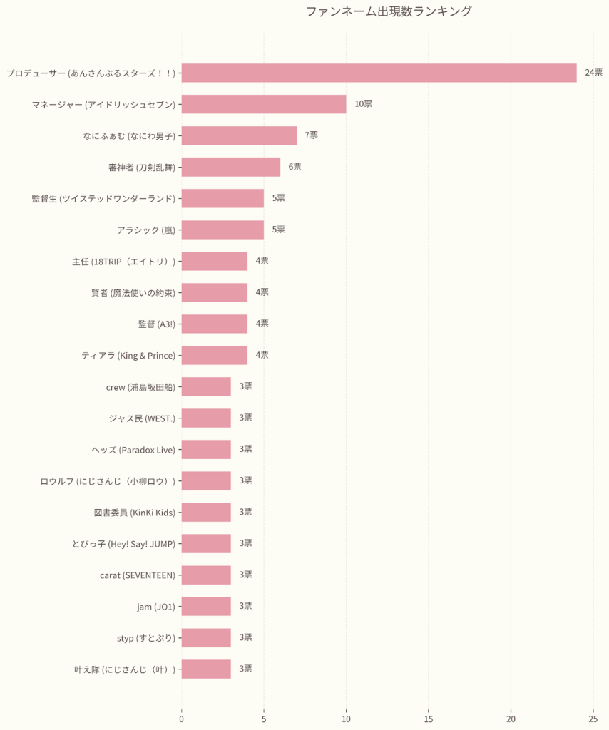 こうして見ると、「プロデューサー」「マネージャー」「審神者」のように、ファンというよりも「推しを支えるパートナー」や「物語の登場人物」としての役割を持ったファンネームが多いのも面白いですね!