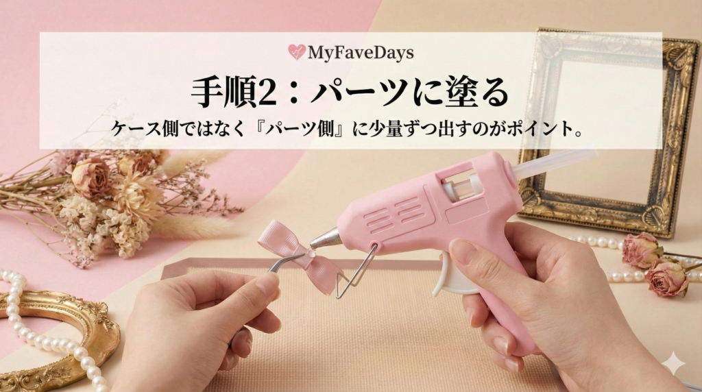 硬質ケースデコの手順4解説画像。ケースの角にリボンパーツを配置している手元のアップ。「手順4:リボンを配置する。上部中央で顔周りを華やかに、または斜め下でバランス良く。」というテキストが記載されている。