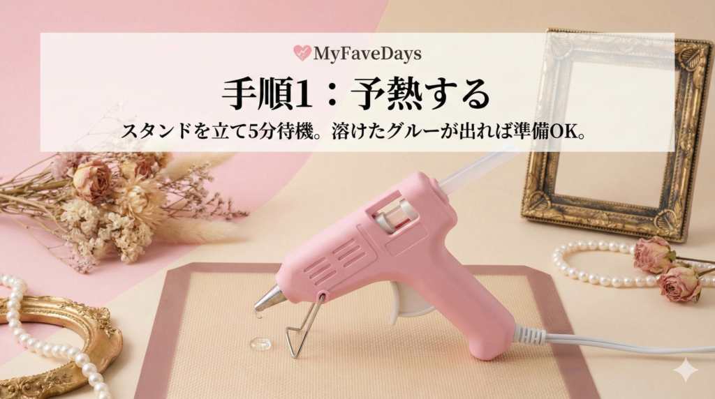 シールタイプでは剥がれ落ちそうで心配な「大きめのリボン」や「重みのあるビジュー」を付ける時は、100円ショップで手に入るグルーガン(ホットボンド)を使うのがおすすめです。