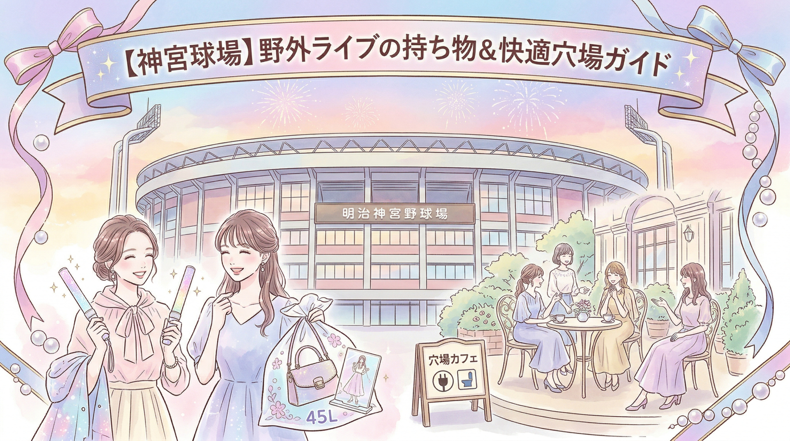 神宮球場での野外ライブは、夕暮れから夜にかけての空のグラデーションや、夜風を感じながらのパフォーマンスなど、屋内にはないエモーショナルな魅力がたっぷりです。 だからこそ、開演前の暇つぶしや事前準備は「スマートに、計画的に」が鉄則。大人女子の余裕を見せつけるスケジュールで、推しとの特別な1日を最後まで美しく楽しんでくださいね!
