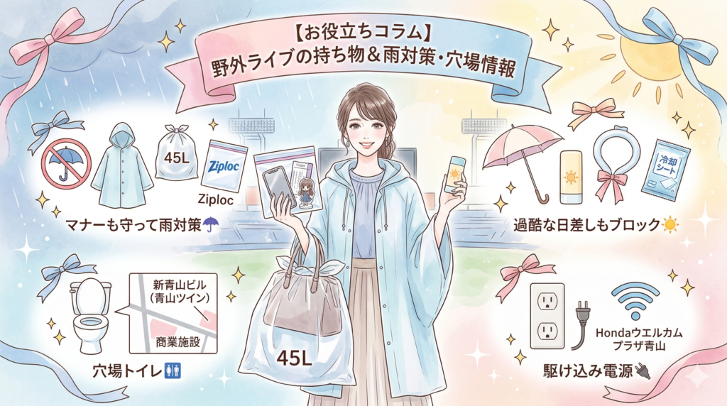 冷えピタやネッククーラー、汗拭きシートはもちろん、日傘(※開演前のみ使用可)と塗り直しやすいスティック日焼け止めを持参しましょう。