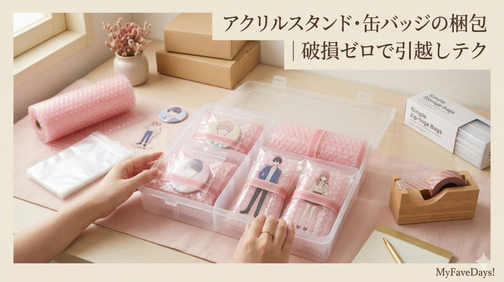 割れやすいアクリルスタンドや、凹みやすい缶バッジは、一つずつ丁寧に保護することが鉄則です。 まずはOPP袋やチャック付き収納袋に入れて表面の傷や水濡れを防ぎ、その上から気泡緩衝材(プチプチ)で2重から3重に包みます。 さらに、プラスチック製の仕切り付きケースに収納してからダンボールに入れると、外部からの圧力を完全に防ぐことができます。