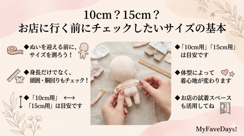 お買い物に行く前に、ご自身のぬいのサイズ(身長や頭囲、胴回りなど)をざっくりとでも測っておくのがおすすめです。また、「10cm用」「15cm用」と書かれていても、ぬいの体型によって着心地が変わることもあります。