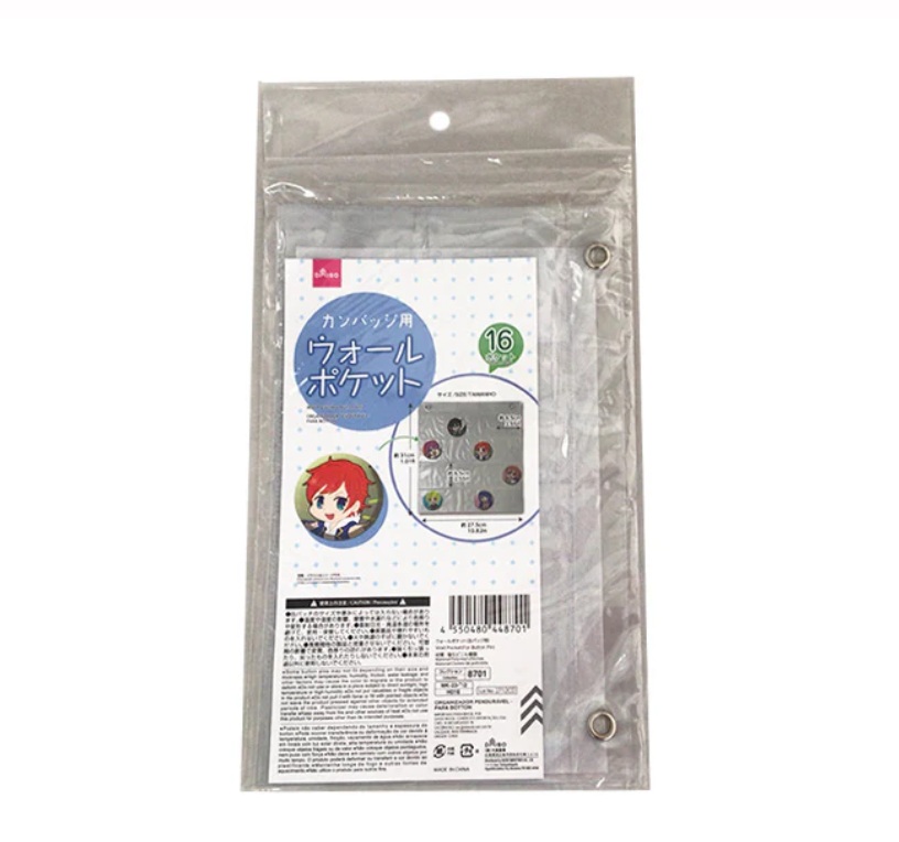 缶バッジを一つずつポケットに入れて壁に飾れます。カレンダー型も人気。