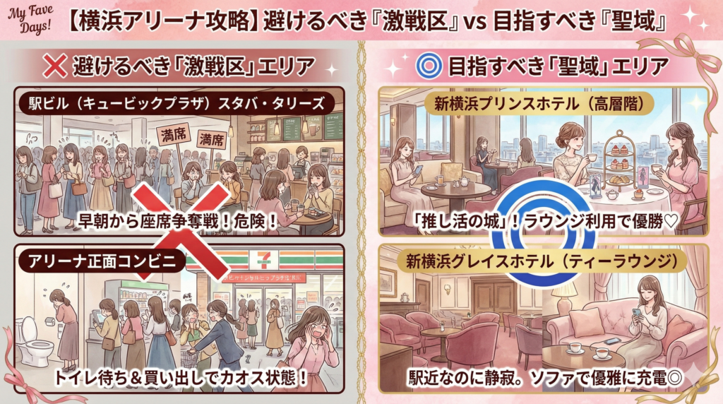 アイキャッチ画像(横長) 横浜アリーナ推し活プランのアイキャッチイラスト。中央にメンカラコーデでペンライトを持った笑顔の女性2人。左側には「避けるべき場所」として混雑した駅ビルカフェやコンビニの行列を描写。右側には「目指すべき場所」として新横浜プリンスホテルの天空アフタヌーンティー、ラーメン博物館での推しラーメン作り、夜景の見えるイタリアンでの打ち上げの様子を対比させている。 ライフスタイル・遠征